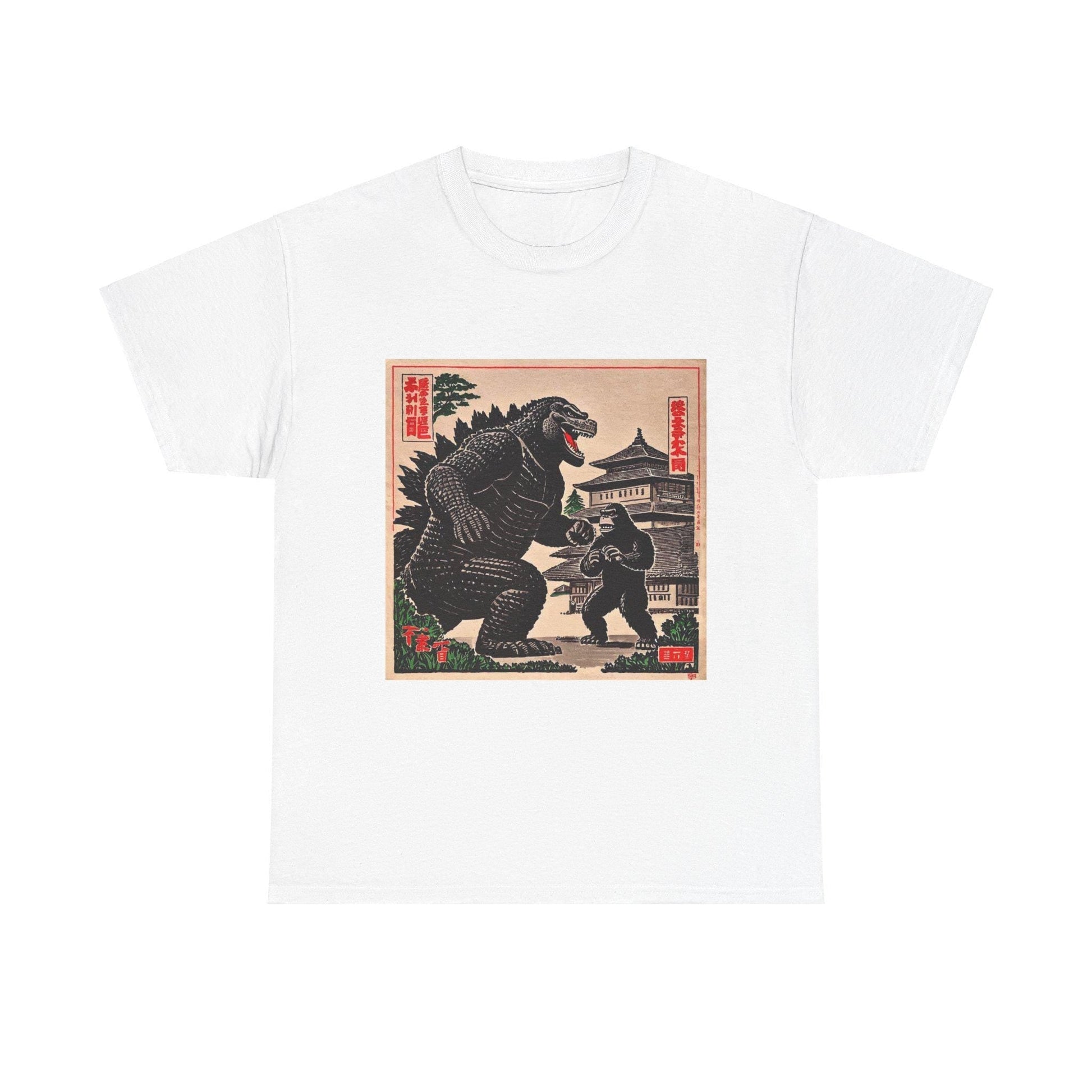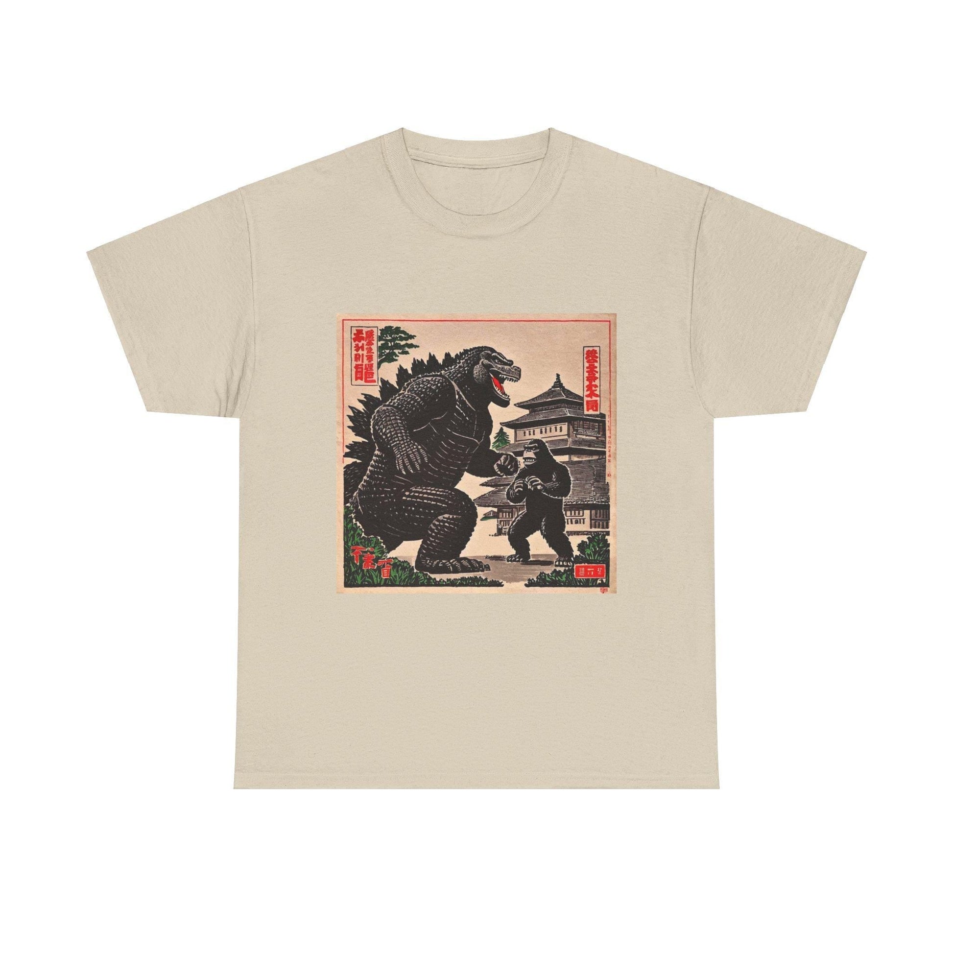 Channel epic monster energy with this Godzilla vs Kong graphic tee styled in traditional Japanese art. Featuring iconic kaiju in a dramatic showdown near ancient temples, this shirt blends pop culture and classic printwork. A must have for monster movie fans and vintage lovers.