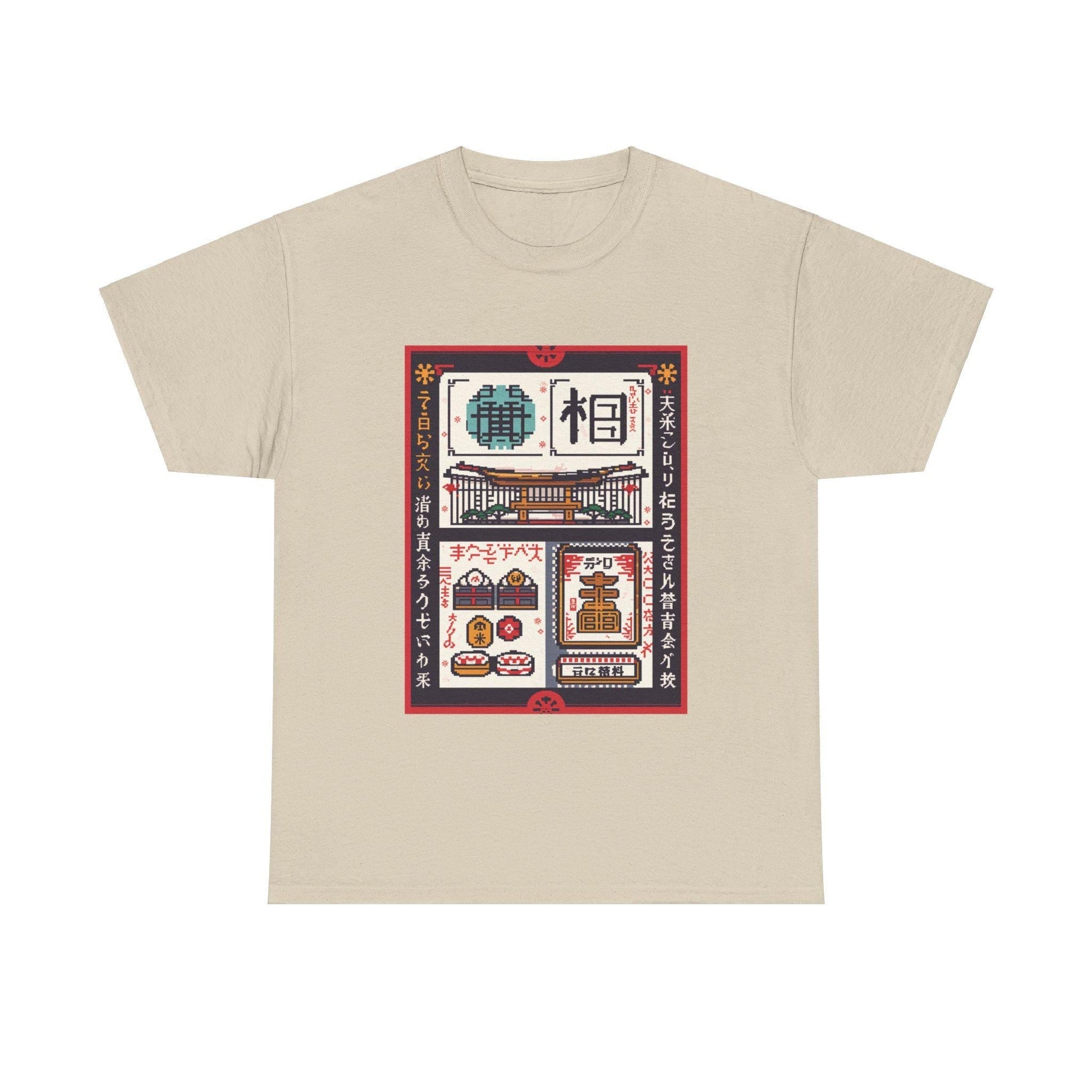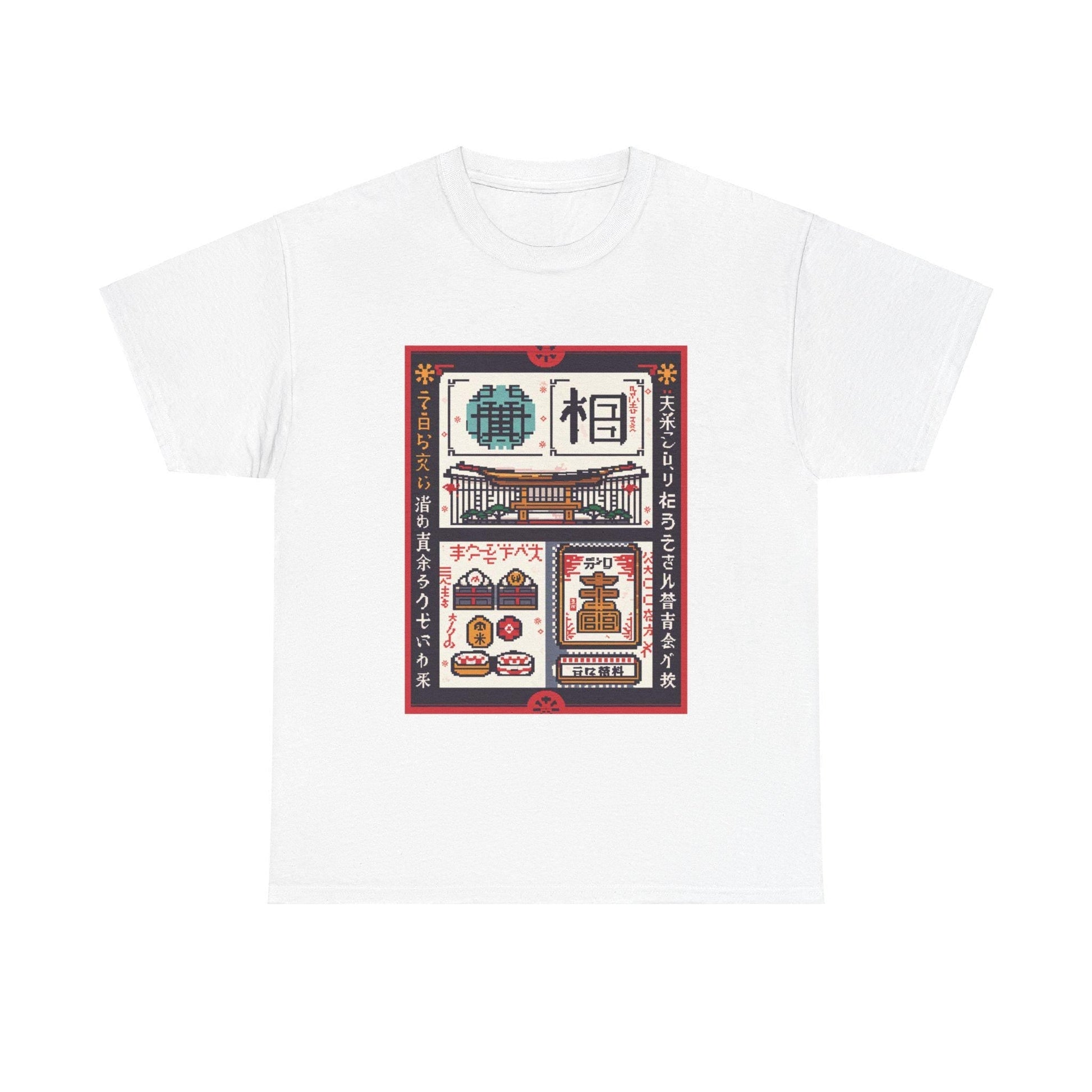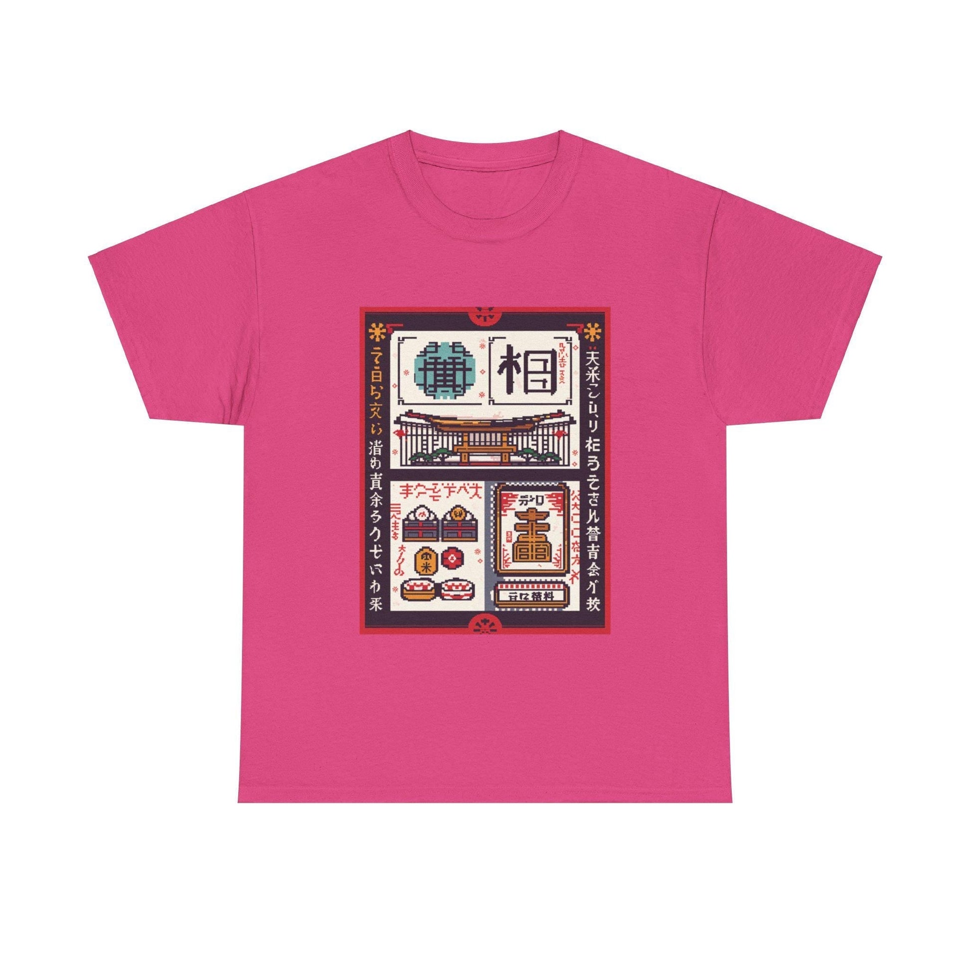 Celebrate nostalgia and Japanese tradition with this retro pixel art t-shirt. The design features pixelated cultural symbols, food, temples, and signage that bring Tokyo vibes to your streetwear. Ideal for gamers, Japan lovers, and vintage style fans who enjoy playful, eye-catching graphics.